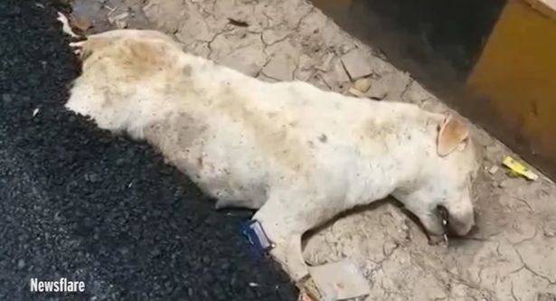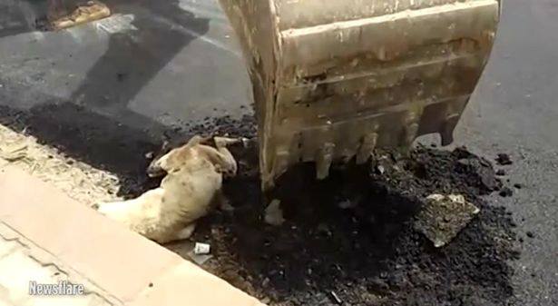 Activists say that the dog was sleeping and , rather than being chased off, was burried alive before being flattend by a roller. The construction workers then left the half-buried dog on the road before it was spotted by the shocked ommuters on the morning of June 13th still clinging to life with its hind legs trapped in the freshly-laid tar.